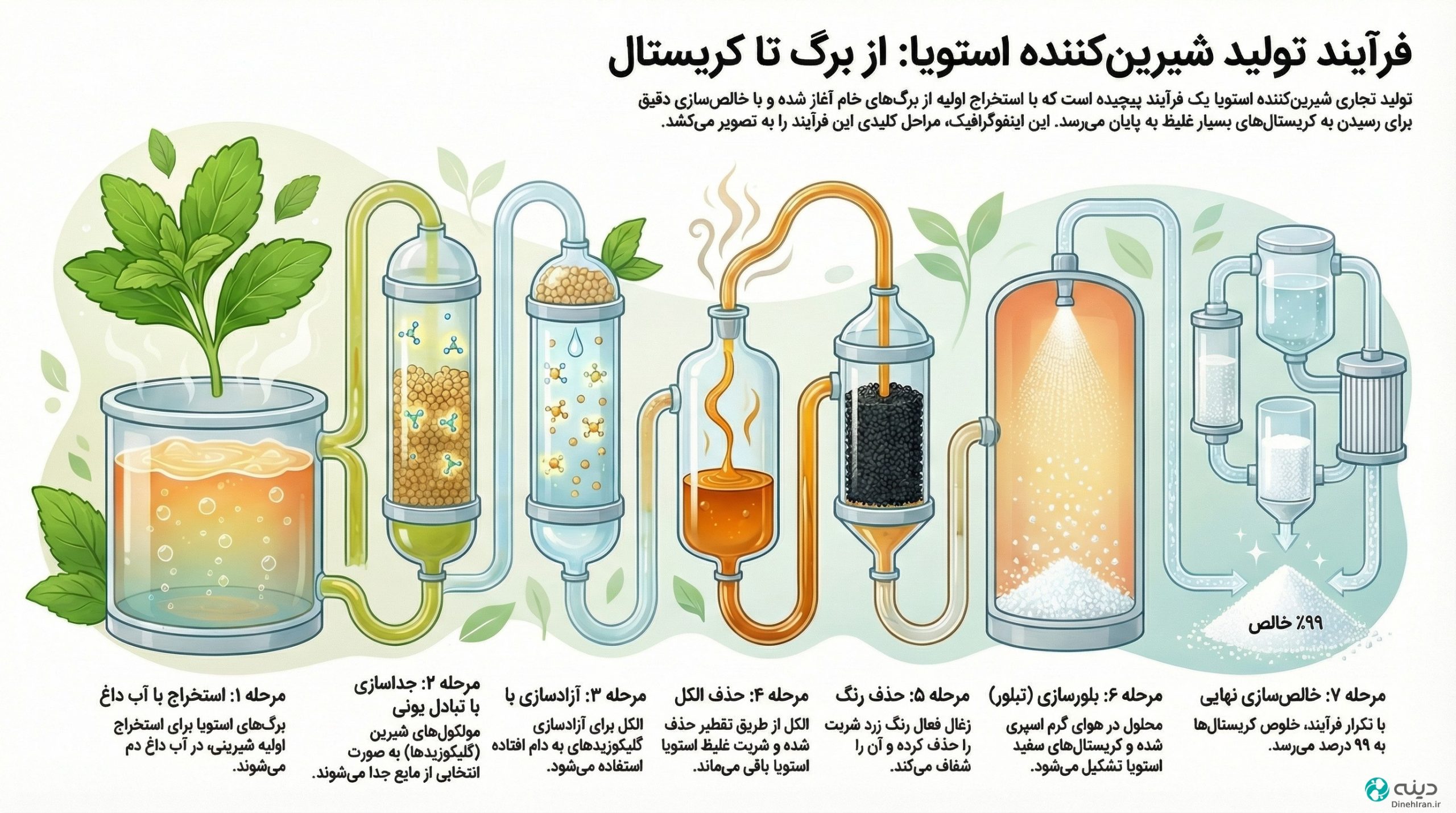 تولید تجاری شیرینکننده استویا شامل فرآیند خالصسازی پیچیده چند مرحلهای است: