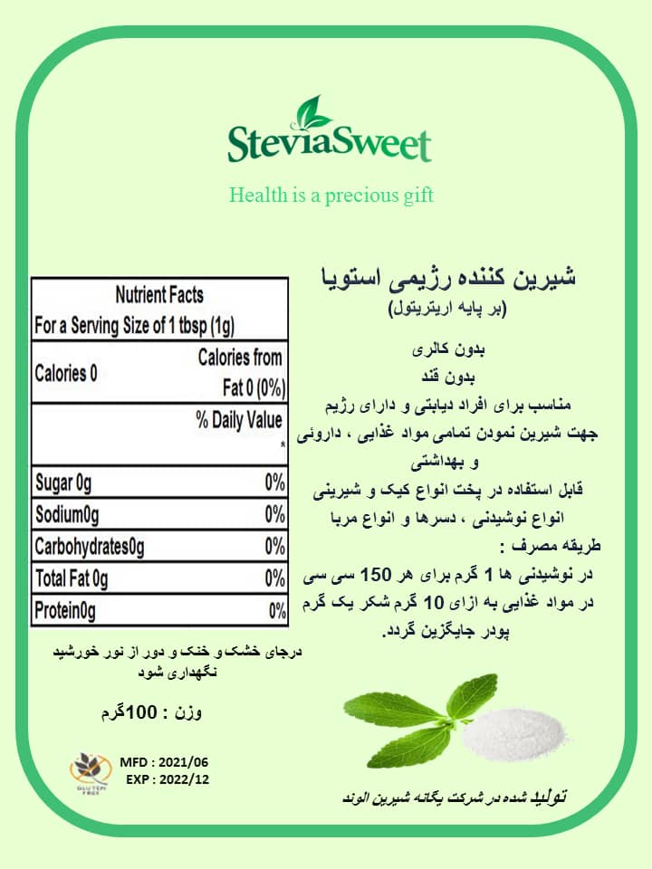 شیرینکننده طبیعی گیاهی (Steviol glycosides)، فاقد قند.